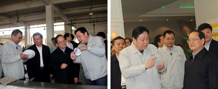 2012年4月6日江西省人民政府省長(zhǎng)鹿心社一行在市委書記鄧保生、市長(zhǎng)劉昌林等省市領(lǐng)導(dǎo)的陪同下來(lái)我司視察工作,鹿心社省長(zhǎng)一行參觀了工廠生產(chǎn)車間、國(guó)瓷館,詳細(xì)了解了公司的生產(chǎn)運(yùn)營(yíng)情 況并對(duì)公司產(chǎn)品贊不絕口。視察期間,鹿心社省長(zhǎng)對(duì)公司給予了高度評(píng)價(jià):“你們公司為景德鎮(zhèn)爭(zhēng)了光,為江西爭(zhēng)了光,為國(guó)家爭(zhēng)了光。"并希望公司能牢牢抓住精品路線,抓住高端市場(chǎng),搞活機(jī)制,繼續(xù)做的更大更好。