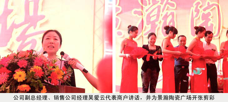 在景瀚陶瓷廣場(chǎng)落成開(kāi)業(yè)慶典儀式上,公司副總吳愛(ài)云受王耀董事長(zhǎng)委托,代表景德鎮(zhèn)陶瓷股份有限公司,代表紅葉陶瓷1號(hào)店,代表所有進(jìn)駐的業(yè)主們發(fā)言。她說(shuō):今天是五星級(jí)陶瓷購(gòu)物天堂——景瀚陶瓷廣場(chǎng)開(kāi)業(yè)的大好日子,受王耀董事長(zhǎng)委托,我僅代表景德鎮(zhèn)陶瓷股份有限公司,代表紅葉陶瓷1號(hào)店,代表所有進(jìn)駐的業(yè)主們,對(duì)景翰陶瓷廣場(chǎng)的開(kāi)業(yè)表示熱烈的祝賀。祝景瀚陶瓷廣場(chǎng)開(kāi)業(yè)大吉,生意興隆。