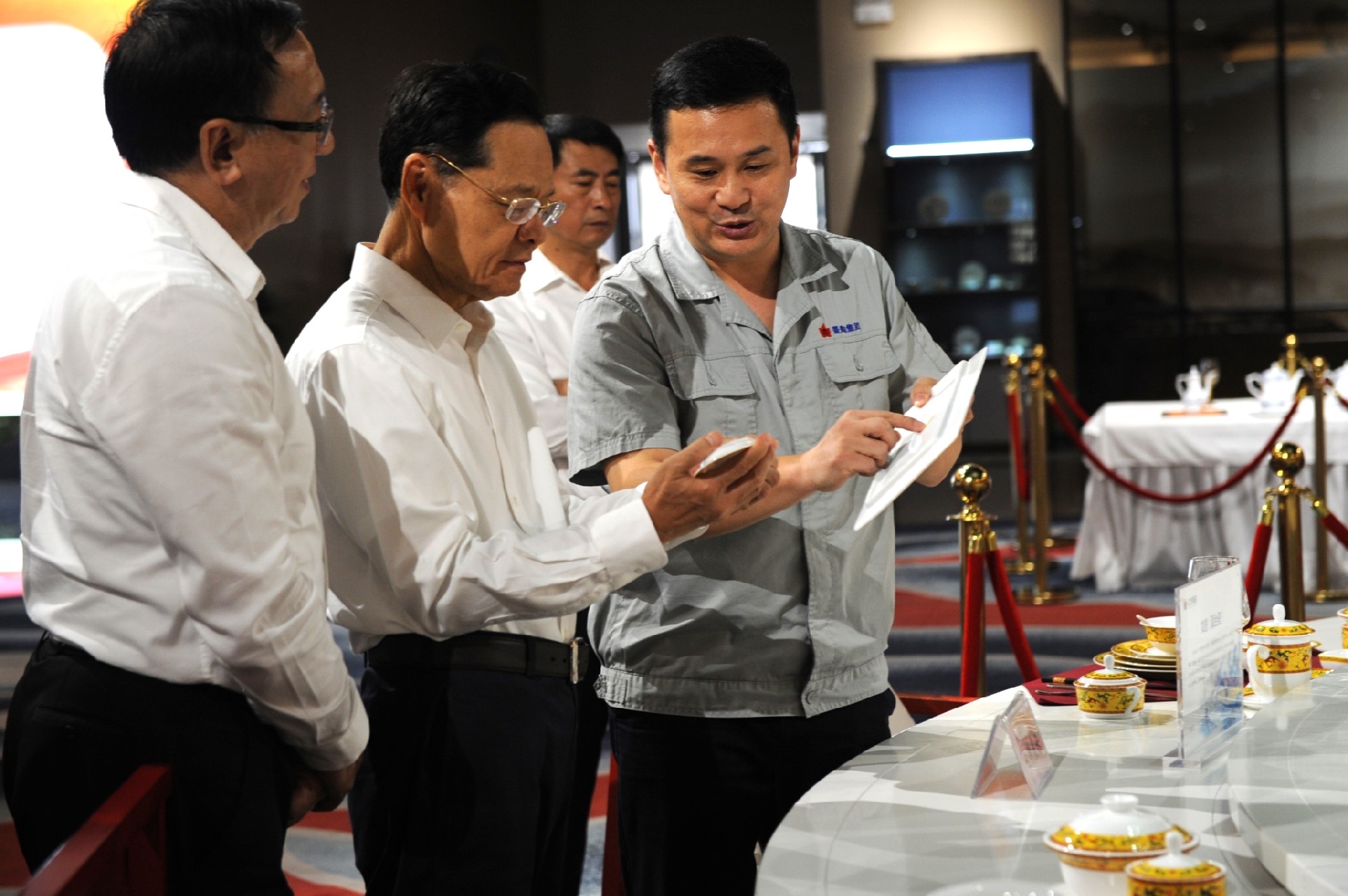走進(jìn)國(guó)瓷館,鄧景揚(yáng)向陳武一行介紹了集團(tuán)的基本情況,國(guó)瓷館展廳規(guī)模。鄧景揚(yáng)介紹說(shuō),“國(guó)瓷館”是目前全世界最大的單一品牌陶瓷展廳。參觀時(shí),陳武興致勃勃地拿起桌上的一套產(chǎn)品仔細(xì)端詳,鄧景揚(yáng)適時(shí)介紹到:“這是我們新開(kāi)發(fā)的一款產(chǎn)品,是一套組合餐具,該產(chǎn)品將日用陶瓷和藝術(shù)陶瓷巧妙結(jié)合,合起來(lái)是一個(gè)花瓶的造型?!薄斑@個(gè)不錯(cuò),有創(chuàng)意!是紅葉品牌嗎?”陳武問(wèn)道?!斑@是我們集團(tuán)旗下一個(gè)“百花”品牌的產(chǎn)品。”隨即,鄧景揚(yáng)向陳武介紹了景陶集團(tuán)發(fā)展脈絡(luò)和以“國(guó)瓷紅葉”為主打品牌,金品陶、百花、家好系統(tǒng)品牌特色,集聚綻放的特點(diǎn)。期間,鄧景揚(yáng)講述了“紅葉”與“御窯”前世今生的關(guān)系和如何將“紅葉”產(chǎn)業(yè)和陶瓷文化進(jìn)一步做大做強(qiáng)制定的新的發(fā)展愿景。鄧景揚(yáng)介紹道,“我們集團(tuán)的發(fā)展愿景是做世界上最精美的瓷器,創(chuàng)百年一流企業(yè),讓‘紅葉’成為世界知名的日用陶瓷中國(guó)民族品牌,用陶瓷講好中國(guó)故事,展中華文化風(fēng)采,讓‘紅葉’成為中華文化走向世界的文明使者。”陳武聽(tīng)后表示十分認(rèn)可和贊同,并勉勵(lì)景陶集團(tuán)進(jìn)一步發(fā)揮好景德鎮(zhèn)陶瓷龍頭企業(yè)的帶頭作用,讓紅葉陶瓷真正走出去。